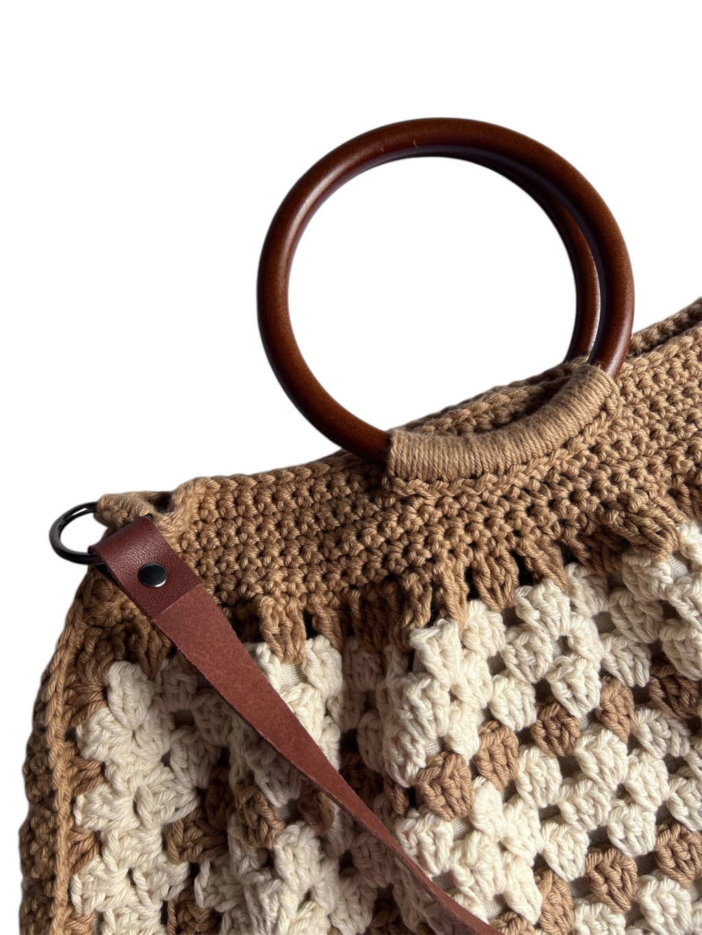 Confeccionada em crochê com fios de algodão em 2 tons: crú e castor.